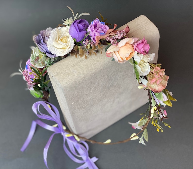 Веночек с нежными цветами и зеленью. Размер универсальный, сзади регулируется лентами.