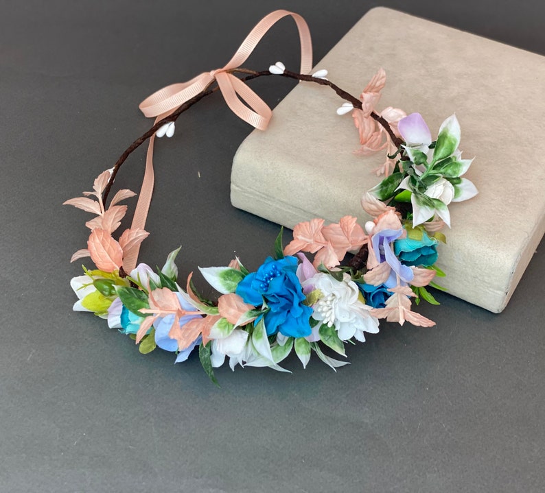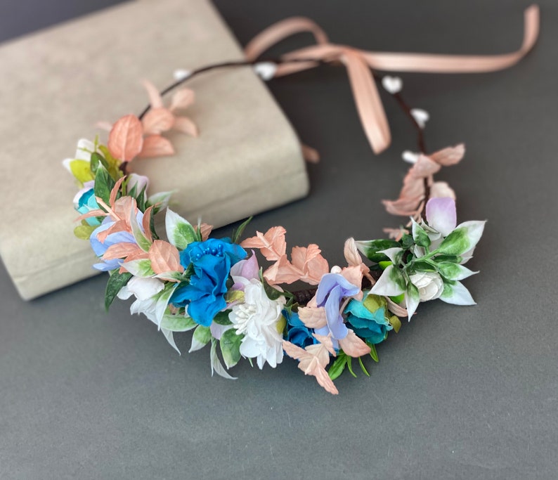 Веночек для волос с синими, белыми цветами, в дополнении зелени. Основа- гибкая, не давит. Размер регулируется сзади лентами.