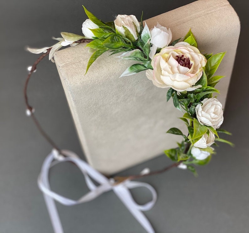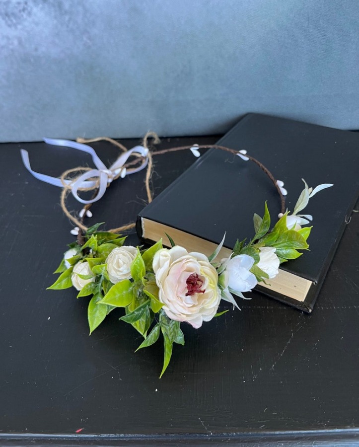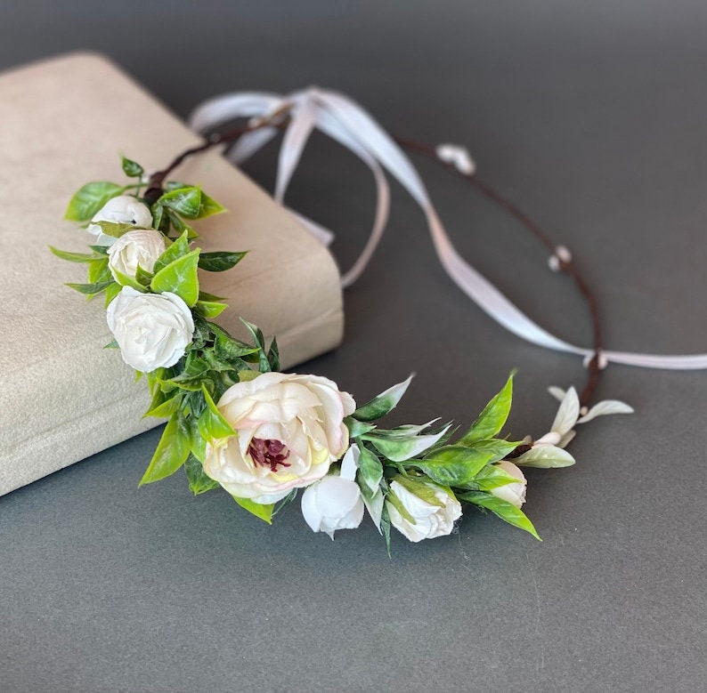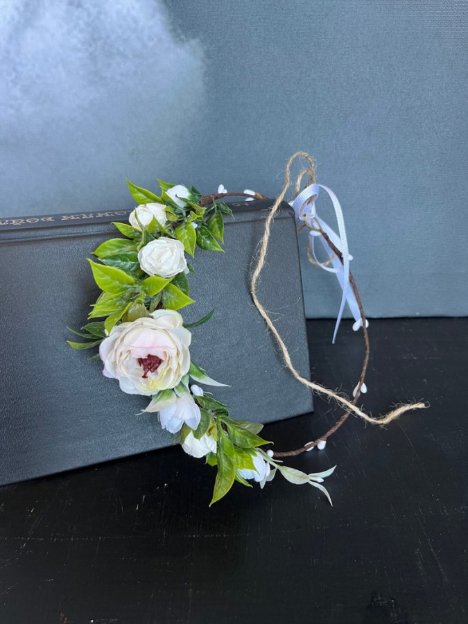 Свадебная веточка с белыми цветами разного размера и зелеными веточками. Основа сделана из гибкой проволоки, не тянет волосы и ложиться в нужном направлении. Размер регулируется сзади лентами.